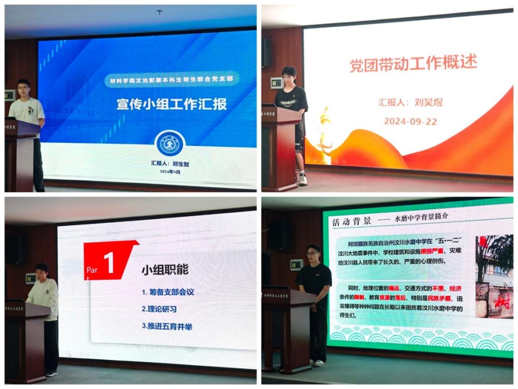 文治彭康本科生师生联合党支部近期工作的了解。郑生智、刘昊煜、刘焕宇、伍乐四位同志依次向大家介绍了党建宣传小组、党团带动小组、党务组织小组、党员服务小组的工作内容、近期工作开展情况和工作成果,同时也展望了未来工作安排,希望在新学年继续加强支部的各项工作建设。