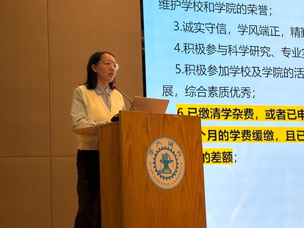 生奖助体系,包括各类奖助学金的申请条件和评审流程等内容。她指出,奖学金评选不仅关注学术成果,更注重综合素质,鼓励新生在学术科研、创新实践、社会服务等领域全面发展。