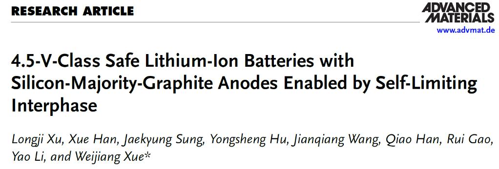 以上工作成果以《自限性界面赋能4.5 V级高硅负极高安全锂离子电池》(“4.5-V-class safe lithium-ion batteries with silicon-majority-graphite anodes enabled by self-limiting interphase”)为题,发表于国际权威杂志《先进材料》(Advanced Materials)。做爱视频