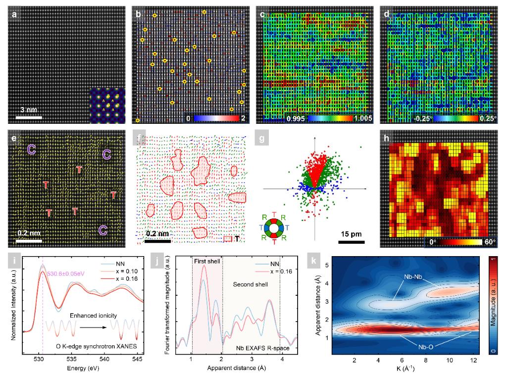 团队首次在介电材料中观测到亚埃级电子云位移,并证明其通过增强Nb–O键离子性、均匀化键长分布,显著提升了极化切换速度与储能效率。